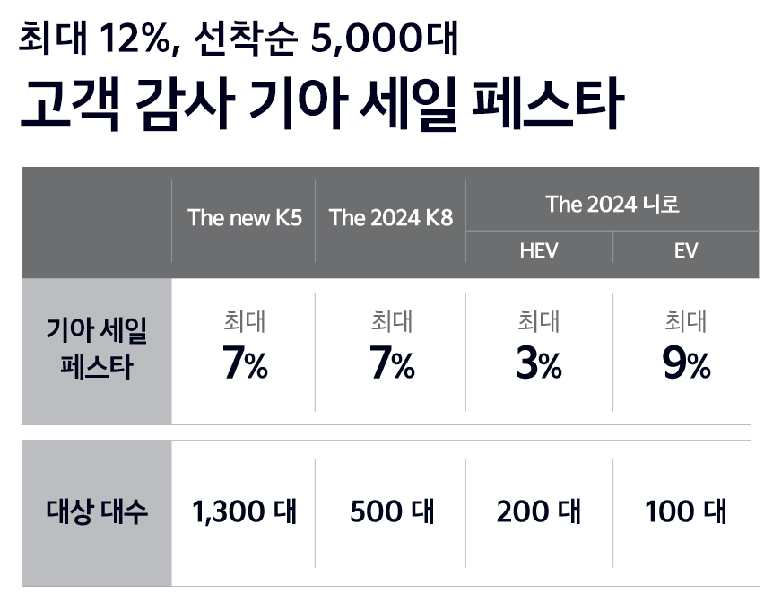 기아자동차는 기아 타이거즈 한국시리즈 우승기념으로 기아 세일 페스타를 진행합니다. 선착순 5천대를 최대 12% 고객 감사 세일제로 할인받고 구매가능합니다.