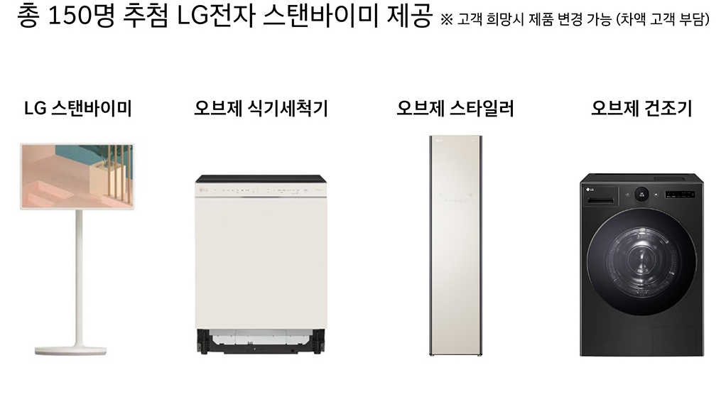 대상 차종 구매 고객 중 추첨을 통해 총 150명에게 LG전자의 인기 가전 제품(스탠바이미 TV, 오브제 스타일러, 오브제 식기세척기, 오브제 건조기 등) 경품 이벤트도 실시합니다.