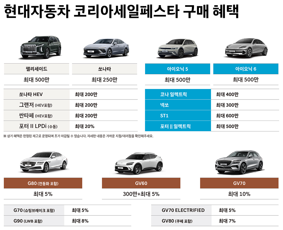 주요 차종별로 ▲소나타, 그랜저, 싼타페 최대 200만 원(하이브리드 포함) ▲팰리세이드 최대 500만 원 ▲아이오닉 5, 아이오닉 6 최대 500만 원 ▲파비스 최대 1,000만 원 ▲제네시스 브랜드 차종 최대 7%가 할인됩니다.