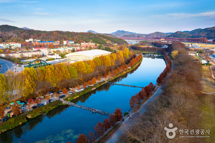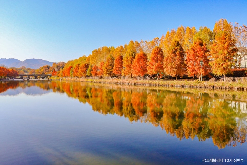 전남 담양의 관방제림은 담양의 관방천에 있는 제방입니다. 길이가 6km에 달하는 긴 둑이 있고 그중 2km에 걸쳐 조성된 숲길은 면적 4만 9228㎡, 추정 수령 300~400년에 달하는 나무들이 빼곡히 들어서 가을 단풍이 끝없이 이어지는 풍경이 장관입니다. 길게 늘어선 단풍나무가 잔잔한 물에 비치는 모습이 한 폭의 그림 같은 곳입니다. 걷기에도 자전거에도 안성맞춤인 길입니다.