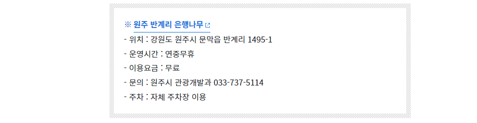 강원도 원주에 있는 반계리 은행나무는 생물학적 보존가치와 예부터 신목으로 모셔와 우리 민속에 주요한 역할을 한 가치로 천연기념물로 지정되어 보호받고 있습니다. 이 은행나무의 수령은 800~100년 정로로 추정되고 높이가 32m, 둘레가 12.27m입니다.