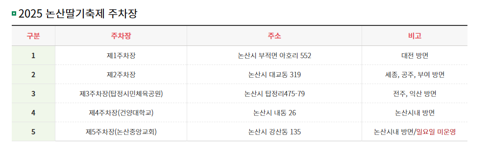 논산딸기축제 기간 동안 방문객들을 위해 무료 주차장과 셔틀버스가 운영됩니다. 주차 공간이 넉넉하지만, 혼잡을 피하기 위해 셔틀버스를 적극 이용하는 것이 좋습니다.